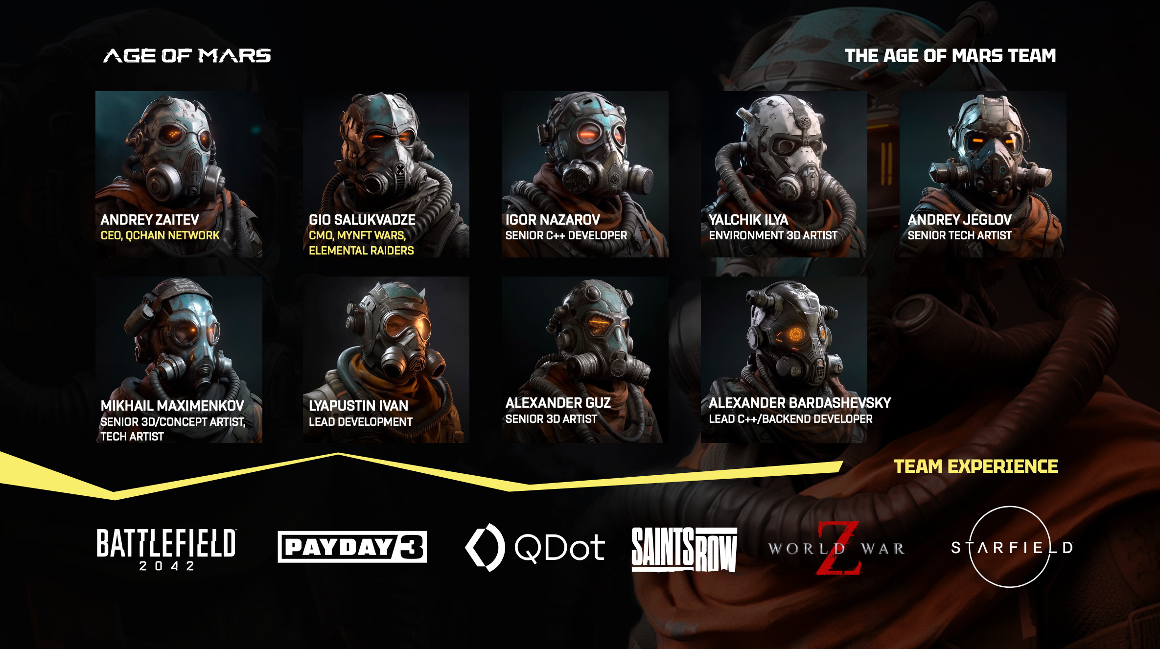 The Age of Mars project is powered by a dynamic and highly skilled team of professionals with extensive experience across a broad spectrum of the gaming industry. From intricate 3D artistry and cutting-edge development to specialized technical and conceptual art, our team brings a wealth of expertise and a track record of success from some of the most renowned titles and studios in the gaming world. This multidisciplinary ensemble is committed to pushing the boundaries of what's possible, leveraging their collective experience to create a groundbreaking experience on Mars.